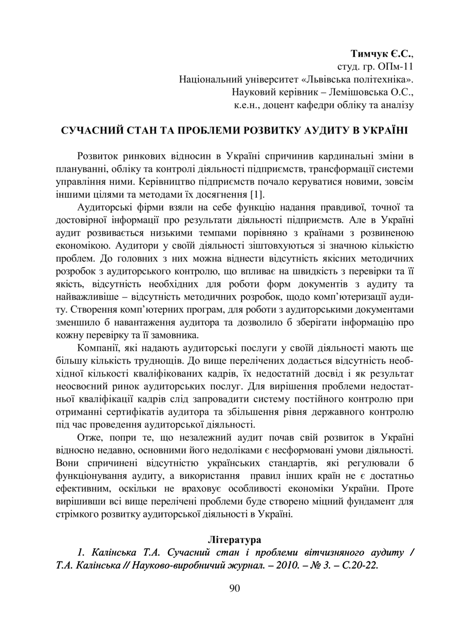 | dc.relation.referencesen | 1. Kalinska T.A. Suchasnyi stan i problemy vitchyznianoho audytu, T.A. Kalinska, Naukovo-vyrobnychyi zhurnal, 2010, No 3, P.20-22. | |