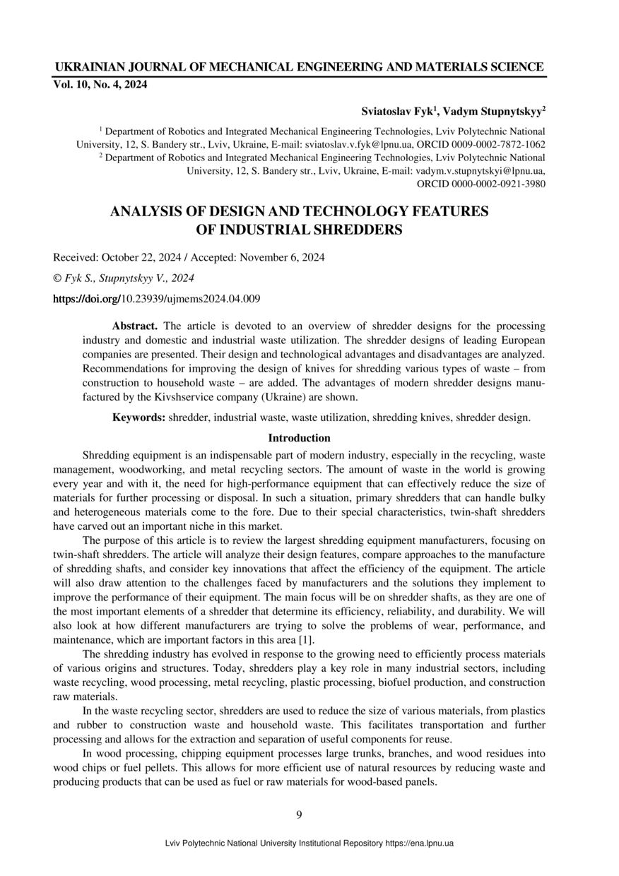 Fyk S. Analysis f design and technology features of industrial shredders / Fyk Sviatoslav, Stupnytskyy Vadym // Ukrainian Journal of Mechanical Engineering and Materials Science. — Lviv : Lviv Politechnic Publishing House, 2024. — Vol 10. — No 4. — P. 9–16.