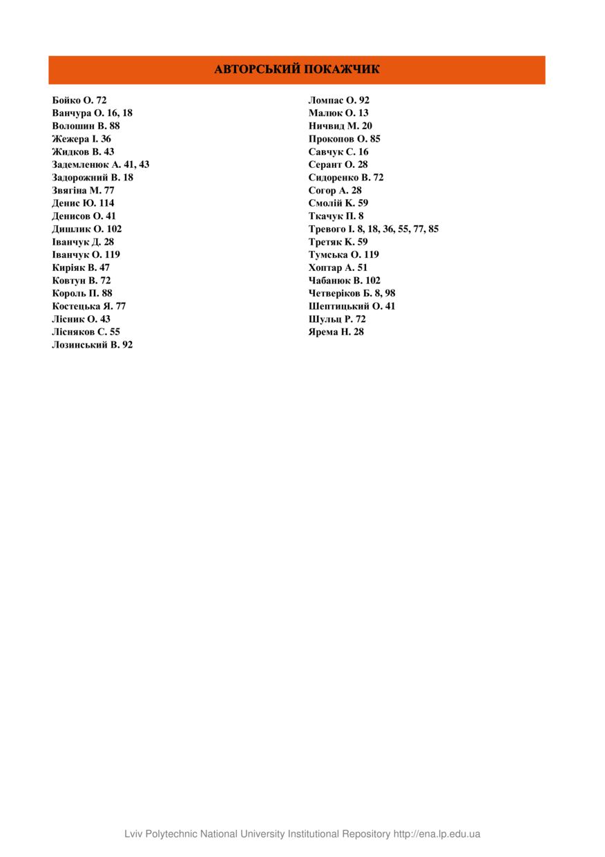 Авторський покажчик // Сучасні досягнення геодезичної науки та виробництва : збірник наукових праць. — Львів : Видавництво Львівської політехніки, 2017. — Том 2 (34). — С. 133.