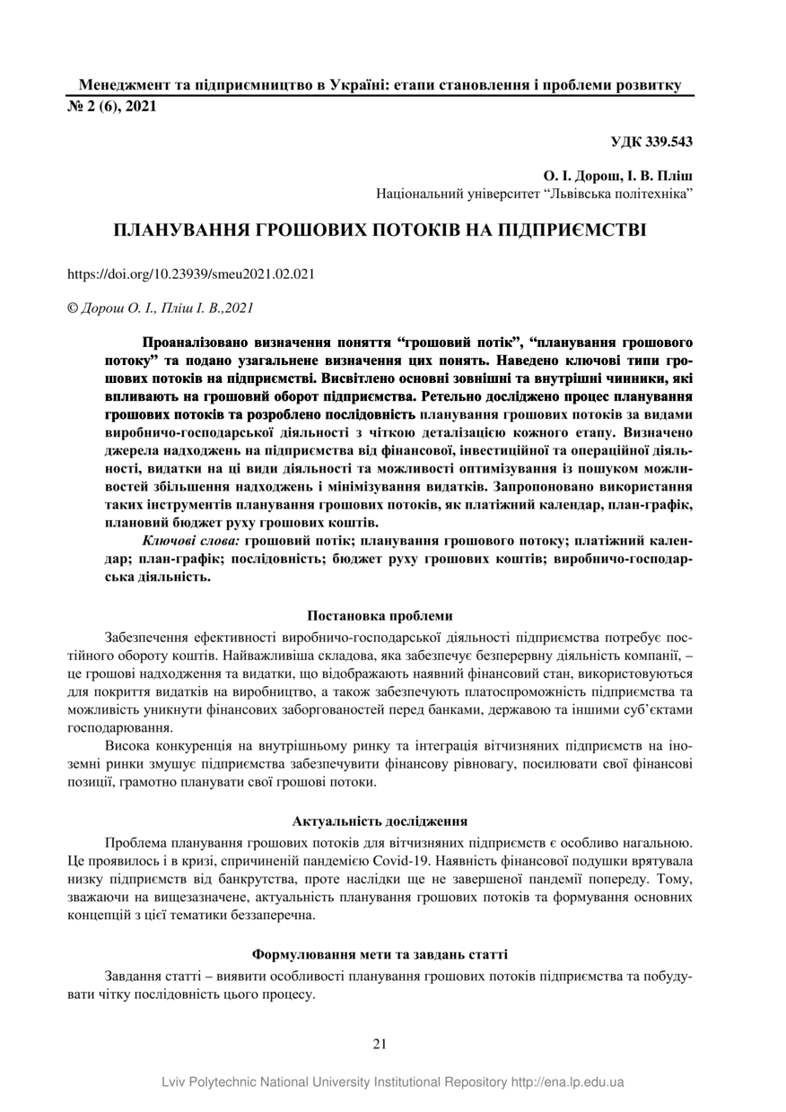 Дорош О. І. Планування грошових потоків на підприємстві / О. І. Дорош, І. В. Пліш // Менеджмент та підприємництво в Україні: етапи становлення і проблеми розвитку : науковий журнал. — Львів : Видавництво Львівської політехніки, 2021. — Том 3. — № 2. — С. 21–28.