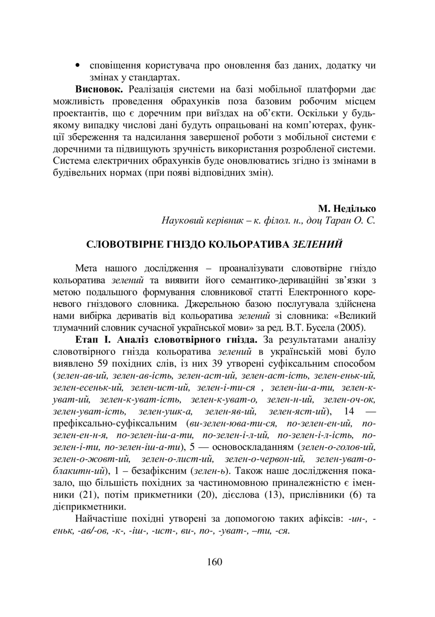 Неділько М. Словотвірне гніздо кольоратива зелений / М. Неділько, О. С. Таран // 76-та Студентська науково-технічна конференція : збірник тез доповідей, жовтень 2018 року, Львів. — Львів : Видавництво Львівської політехніки, 2018. — С. 160–161. — (Секція комп’ютерних наук та інформаційних технологій).
