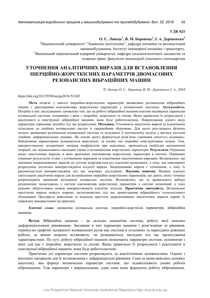 Ланець О. С. Уточнення аналітичних виразів для встановлення інерційно-жорсткісних параметрів двомасових резонансних вібраційних машин / О. С. Ланець, В. М. Боровець, І. А. Деревенько // Автоматизація виробничих процесів у машинобудуванні та приладобудуванні : український міжвідомчий науково-технічний збірник. — Львів : Видавництво Львівської політехніки, 2018. — Том 52. — С. 43–56.