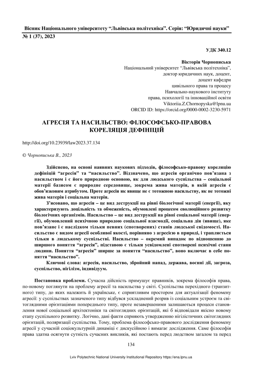 | dc.identifier.citationen | Chornopyska V. Aggression and violence: philosophical and legal correlation of definitions / Chornopyska Victoria // Visnyk Natsionalnoho universytetu "Lvivska politekhnika". Serie: Yurydychni nauky. — Lviv : Lviv Politechnic Publishing House, 2023. — No 1(37). — P. 134–139. | |