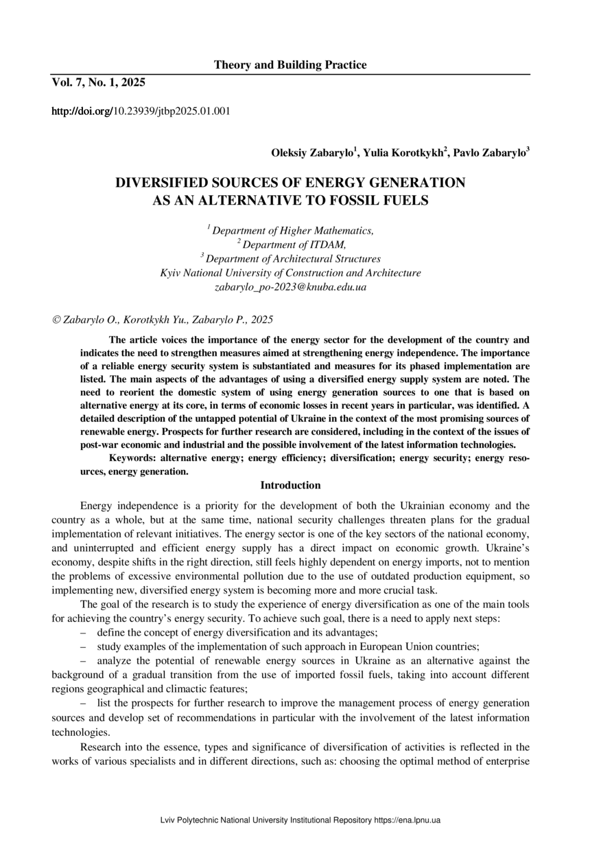 Zabarylo O. Diversified sources of energy generation as an alternative to fossil fuels / Oleksiy Zabarylo, Yulia Korotkykh, Pavlo Zabarylo // Theory and Building Practice. — Lviv : Lviv Politechnic Publishing House, 2025. — Vol 7. — No 1. — P. 1–7.