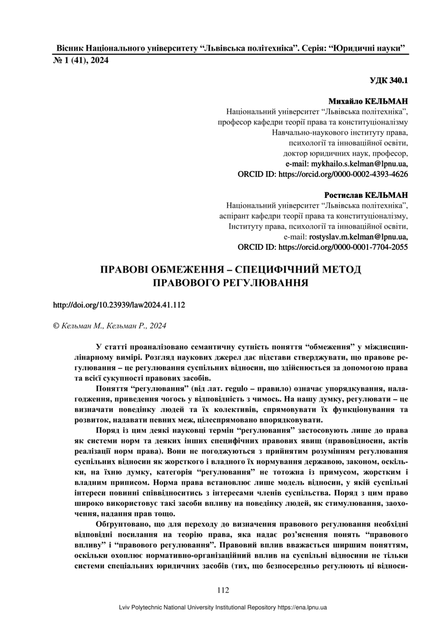 Кельман М. Правові обмеження – специфічний метод правового регулювання / Михайло Кельман, Ростислав Кельман // Вісник Національного університету “Львівська політехніка”. Серія: “Юридичні науки”. — Львів : Видавництво Львівської політехніки, 2024. — № 1(41). — С. 112–121.