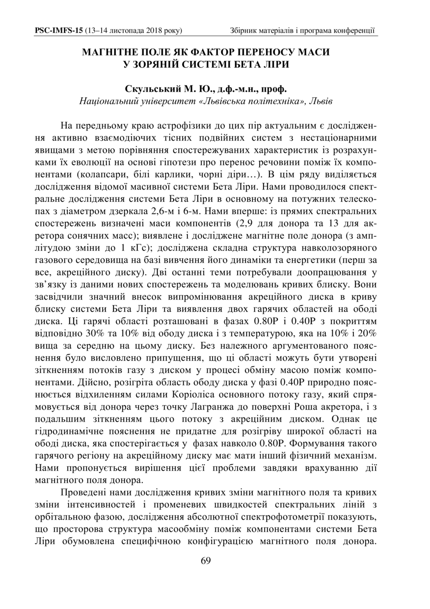 Скульський М. Ю. Магнітне поле як фактор переносу маси у зоряній системі Бета Ліри / М. Ю. Скульський // 15-та Відкрита наукова конференція Інституту прикладної математики та фундаментальних наук (ІМФН) : збірник матеріалів і програма конференції, 13–14 листопада 2018 року, Львів. — Львів : Видавництво Львівської політехніки, 2018. — С. 69–70. — (Теоретична і експериментальна фізика).