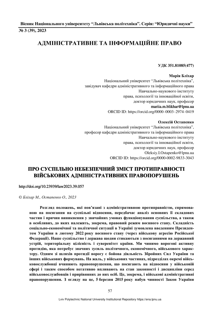 | dc.identifier.citation | Бліхар М. Про суспільно небезпечний зміст протиправності військових адміністративних правопорушень / Марія Бліхар, Олексій Остапенко // Вісник Національного університету “Львівська політехніка”. Серія: “Юридичні науки”. — Львів : Видавництво Львівської політехніки, 2023. — № 3 (39). — С. 57–65. | |