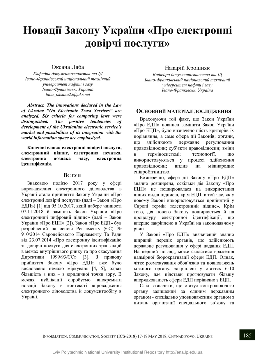 Лаба О. Новації Закону України «Про електронні довірчі послуги» / Оксана Лаба, Назарій Крошняк // Інформація, комунікація, суспільство : матеріали 7-ї Міжнародної наукової конференції, 17–19 травня 2018 року, Чинадієво. — Львів : Видавництво Львівської політехніки, 2018. — С. 185–186. — (Електронна демократія та електронне урядування).