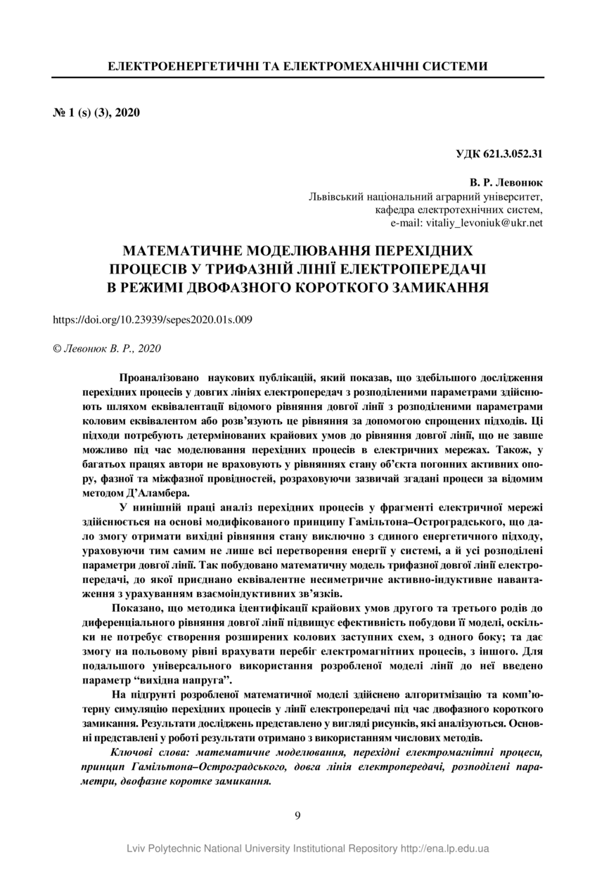 Левонюк В. Р. Математичне моделювання перехідних процесів у трифазній лінії електропередачі в режимі двофазного короткого замикання / В. Р. Левонюк // Електроенергетичні та електромеханічні системи. — Львів : Видавництво Львівської політехніки, 2020. — Том 3. — № 1(s). — С. 9–17.