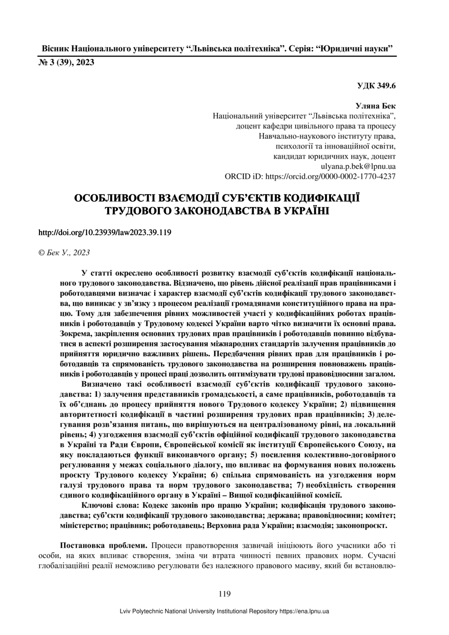 Бек У. Особливості взаємодії суб’єктів кодифікації трудового законодавства в Україні / Уляна Бек // Вісник Національного університету “Львівська політехніка”. Серія: “Юридичні науки”. — Львів : Видавництво Львівської політехніки, 2023. — № 3 (39). — С. 119–127.