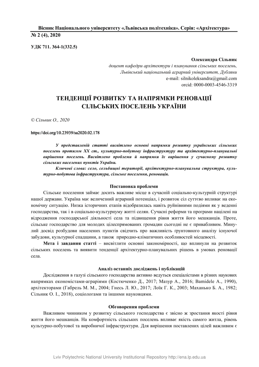 | dc.relation.referencesen | Silʹnyk O. I. 2018. Arxitekturno-planuvalʹna kompozycija u formuvannja silʹsʹkyx poselenʹ Ukrajiny. Visnyk Lʹvivsʹkoho nacionalʹnoho ahrarnoho universytetu: arxitektura i silʹsʹkohospodarsʹke budivnyctvo. | |