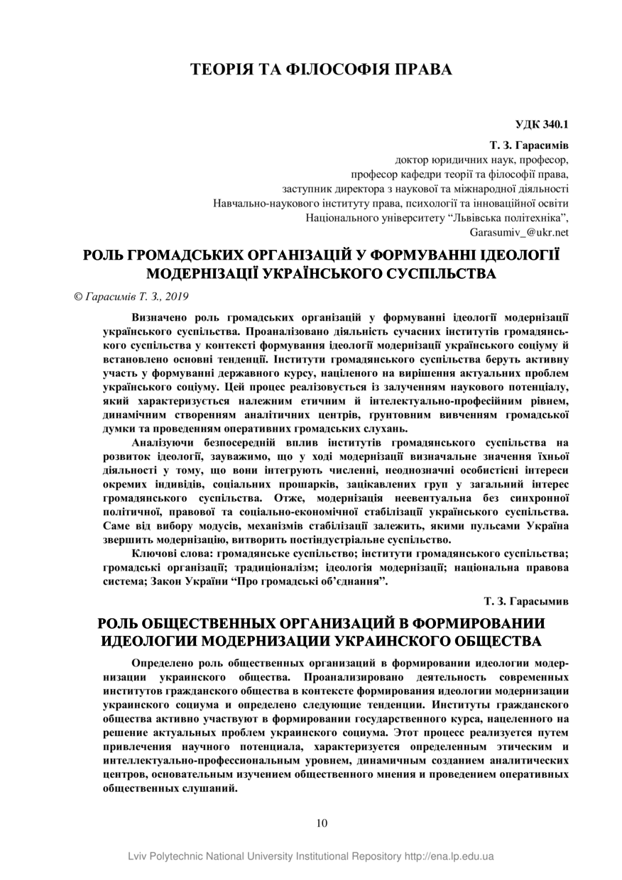 Гарасимів Т. З. Роль громадських організацій у формуванні ідеології модернізації українського суспільства / Т. З. Гарасимів // Вісник Національного університету “Львівська політехніка”. Серія: Юридичні науки. — Львів : Видавництво Львівської політехніки, 2019. — № Випуск 23. — С. 10–17.