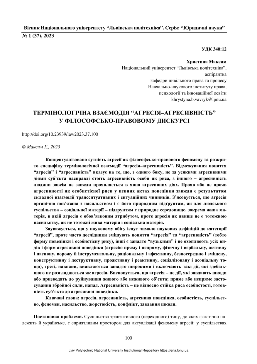 | dc.title.alternative | The terminological interaction “aggression-aggressiveness” in the philosophical and legal discourse | |