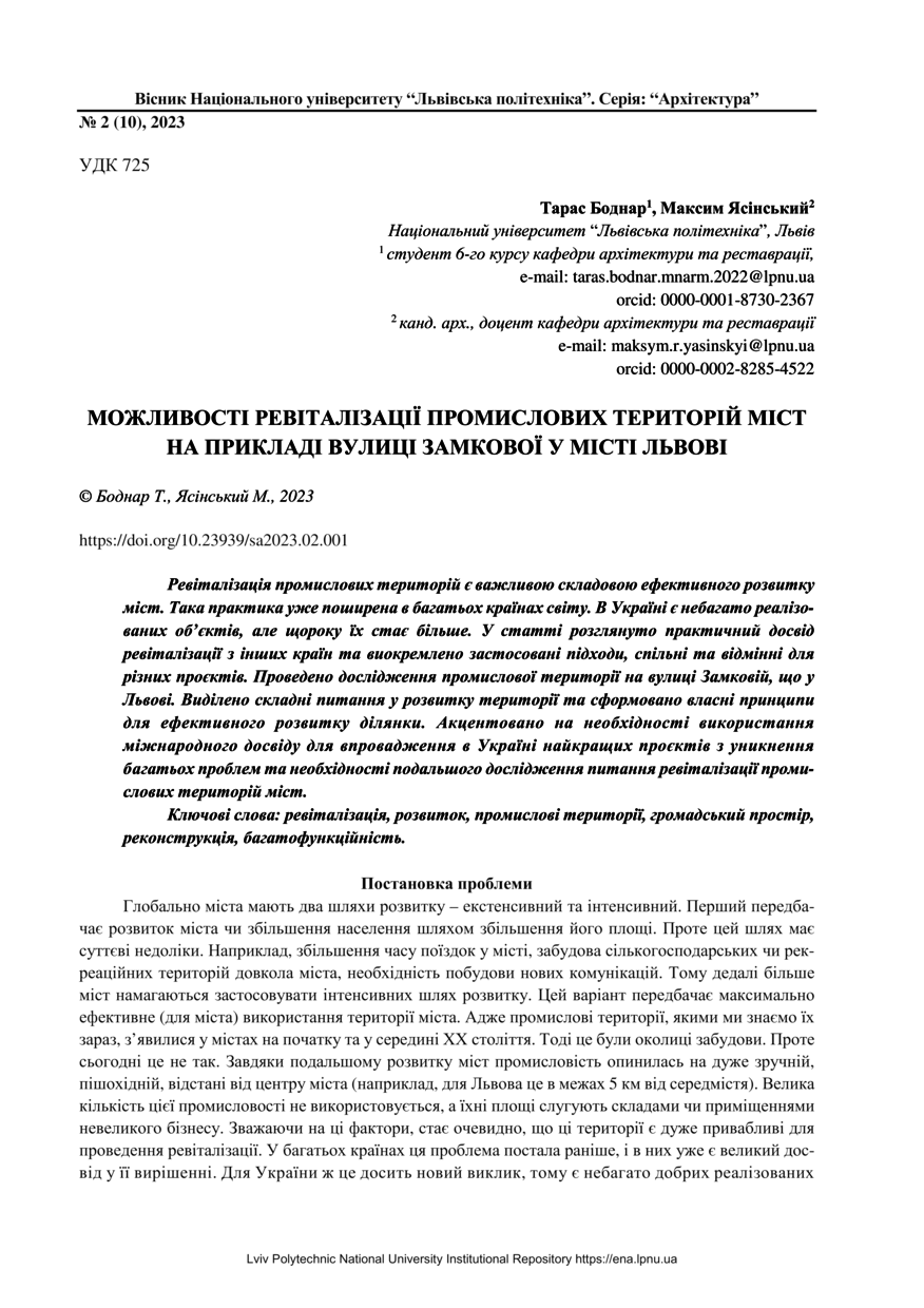 | dc.identifier.citationen | Bodnar T. Possibility of industrial areas revitalization in the example of Zamkova street in Lviv, Ukraine / Taras Bodnar, Maksym Yasinskyi // Visnyk Natsionalnoho universytetu "Lvivska politekhnika". Serie: Arkhitektura. — Lviv : Lviv Politechnic Publishing House, 2023. — No 5 (2). — P. 1–13. | |