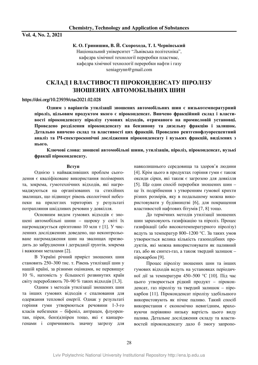 | dc.identifier.citation | Гринишин К. О. Склад і властивості піроконденсату піролізу зношених автомобільних шин / К. О. Гринишин, В. Й. Скорохода, Т. І. Червінський // Chemistry, Technology and Application of Substances. — Lviv : Lviv Politechnic Publishing House, 2021. — Том 4. — № 2. — С. 28–32. | |