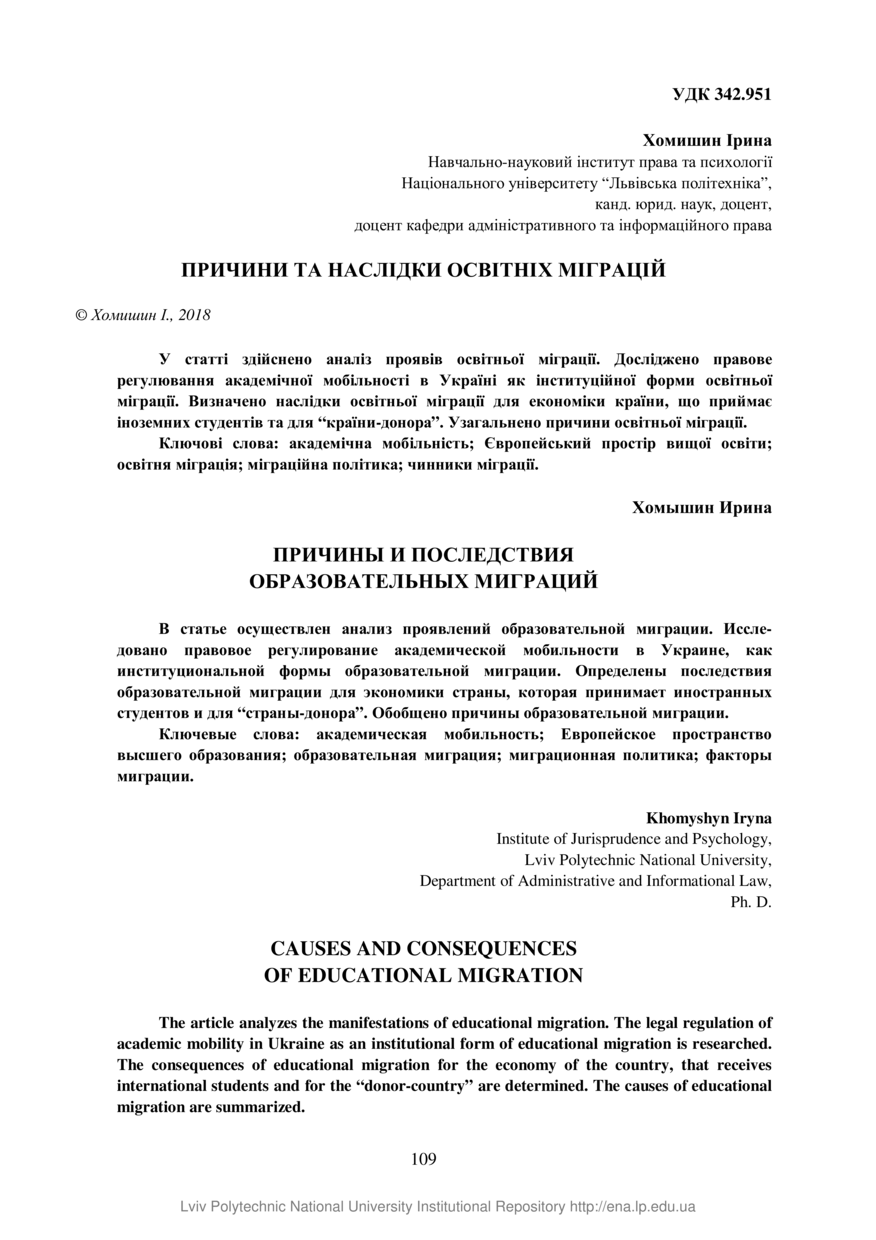 Хомишин І. Причини та наслідки освітніх міграцій / Ірина Хомишин // Вісник Національного університету “Львівська політехніка”. Серія: Юридичні науки. — Львів : Видавництво Львівської політехніки, 2018. — № 906 (20). — С. 109–116.