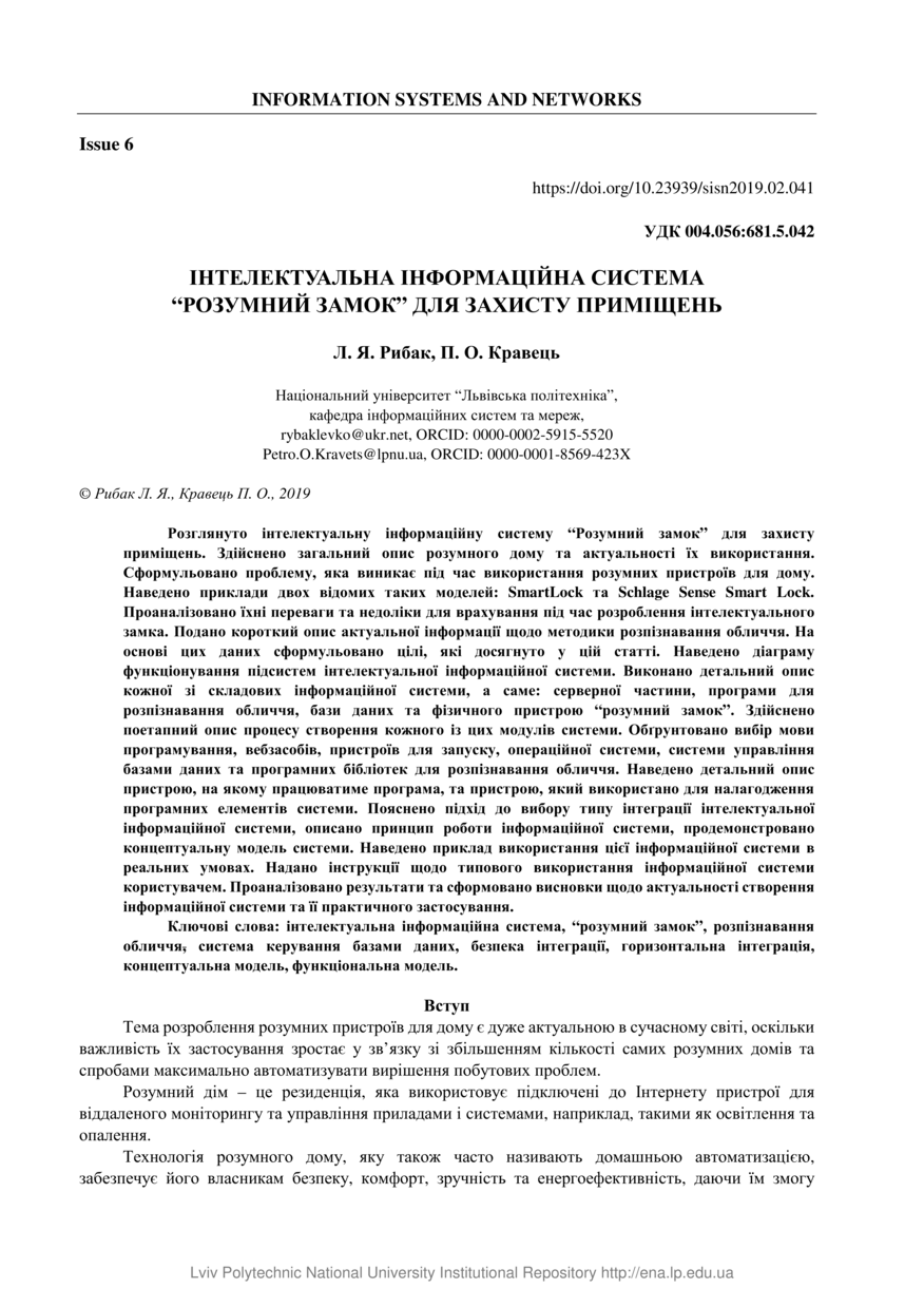 Рибак Л. Я. Інтелектуальна інформаційна система «розумний замок» для захисту приміщень / Л. Я. Рибак, П. О. Кравець // Вісник Національного університету "Львівська політехніка". Інформаційні системи та мережі. — Львів : Видавництво Львівської політехніки, 2019. — № 6. — С. 41–51.