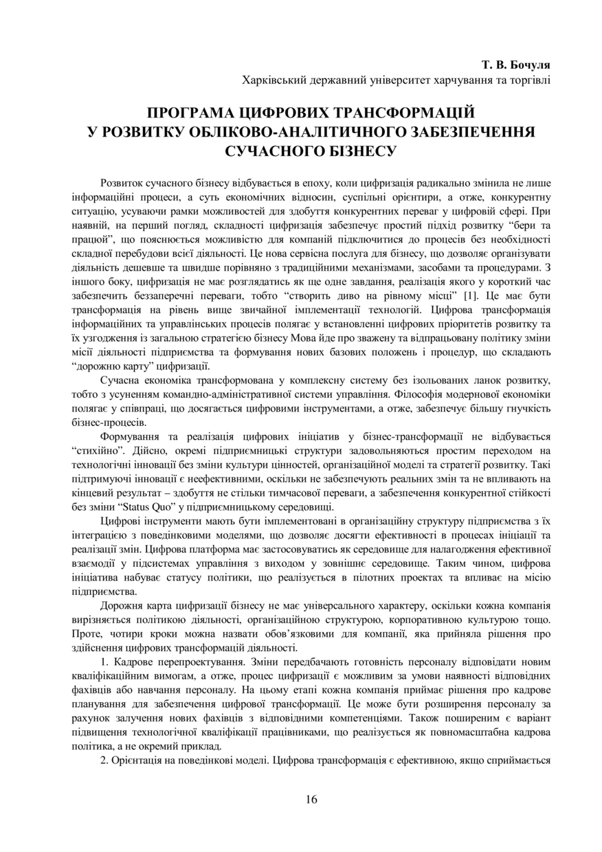Бочуля Т. В. Програма цифрових трансформацій у розвитку обліково-аналітичного забезпечення сучасного бізнесу / Т. В. Бочуля // Обліково-аналітичне забезпечення системи менеджменту підприємства : матеріали IV Міжнародної науково-практичної конференції, 24-26 жовтня 2019 року, Львів. — Львів : Видавництво Львівської політехніки, 2019. — С. 16–17.