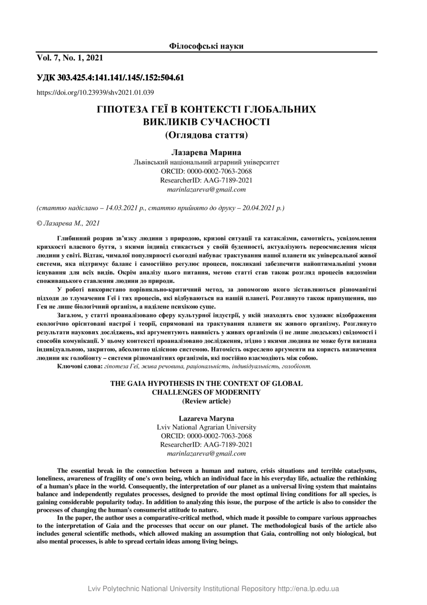 Lazereva M. The Gaia Hypothesis in the Context of Global Challenges of Contemporaneity. / Maryna Lazereva // Humanitarian Vision. — Lviv : Lviv Politechnic Publishing House, 2021. — Vol 7. — No 1. — P. 39–45.