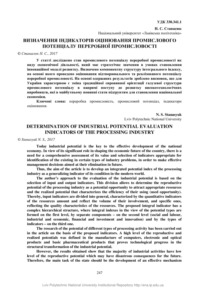 Станасюк Н. С. Визначення індикаторів оцінювання промислового потенціалу переробної промисловості / Н. С. Станасюк // Вісник Національного університету "Львівська політехніка". Серія : Менеджмент та підприємництво в Україні: етапи становлення і проблеми розвитку : збірник наукових праць. — Львів : Видавництво Львівської політехніки, 2017. — № 862. — С. 247–253.