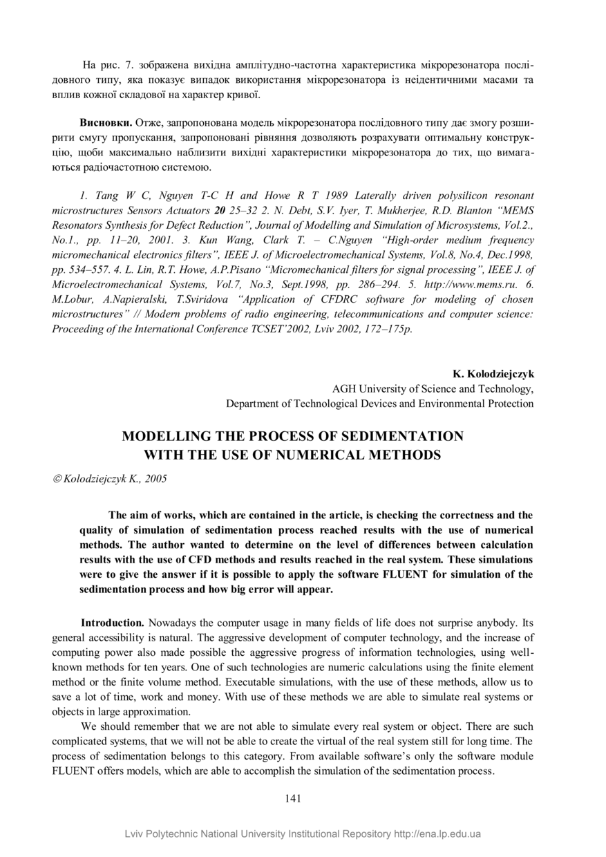 Kolodziejczyk K. Modelling the process of sedimentation with the use of numerical methods / K. Kolodziejczyk // Вісник Національного університету “Львівська політехніка”. — Львів : Видавництво Національного університету “Львівська політехніка”, 2005. — № 548 : Комп’ютерні системи проектування. Теорія і практика. — С. 141–150.