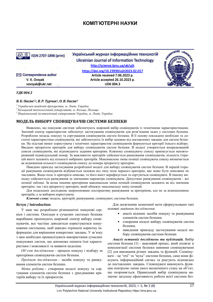 Овсяк В. К. Модель вибору сповіщувачів системи безпеки / В. К. Овсяк, В. Р. Турчак, О. В. Овсяк // Український журнал інформаційних технологій. — Львів : Видавництво Львівської політехніки, 2023. — Том 5. — № 2. — С. 17–24.