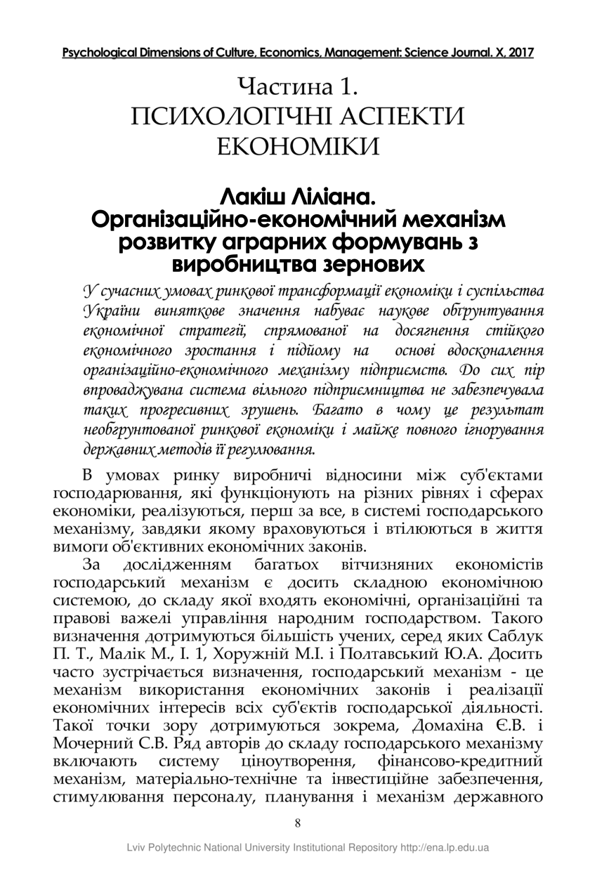 Лакіш Л. Організаційно-економічний механізм розвитку аграрних формувань з виробництва зернових / Ліліана Лакіш // Психологічні виміри культури, економіки, управління : науковий журнал. — Львів : ТзОВ «Ліга-Прес», 2017. — Том 10. — С. 8–12.