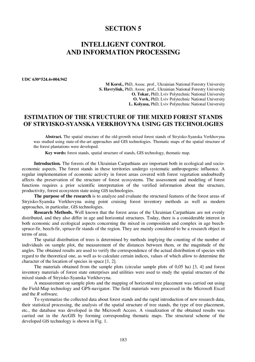 Estimation of the structure of the mixed forest stands of Stryisko-Syanska Verkhovyna using gis technologies / M. Korol, S. Havryliuk, O. Tokar, O. Vovk, L. Kolyasa // Автоматика/Automatiсs – 2018 : матеріали XXV Міжнародної конференція з автоматичного управління, 18–19 вересня 2018 року, Львів. — Львів : Видавництво Львівської політехніки, 2018. — С. 183–184. — (Intelligent control and information processing).