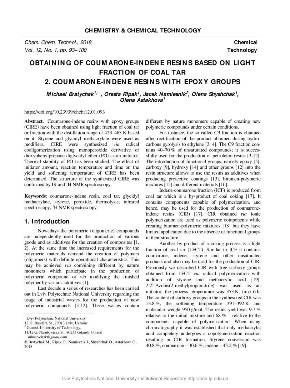 Obtaining of coumarone-indene resins based on light fraction of coal tar. 2. Coumarone-indene resins with epoxy groups / Michael Bratychak, Oresta Ripak, Jacek Namiesnik, Olena Shyshchak, Olena Astakhova // Chemistry & Chemical Technology. — Lviv : Lviv Politechnic Publishing House, 2-18. — Vol 12. — No 1. — P. 93–100.