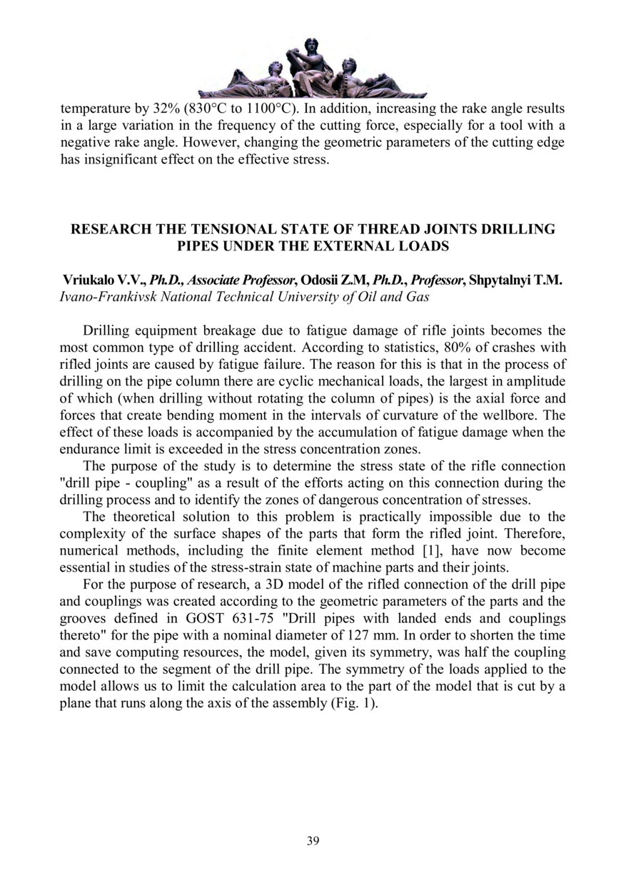Vriukalo V. V. Research the tensional state of thread joints drilling pipes under the external loads / V. V. Vriukalo, Z. M. Odosii, T. M. Shpytalnyi // Прогресивні технології в машинобудуванні : збірник наукових праць IХ-ої Міжнародної науково-технічної конференції, 03-07 лютого 2020 року, Львів-Плай. — Львів, 2020. — С. 39–41.