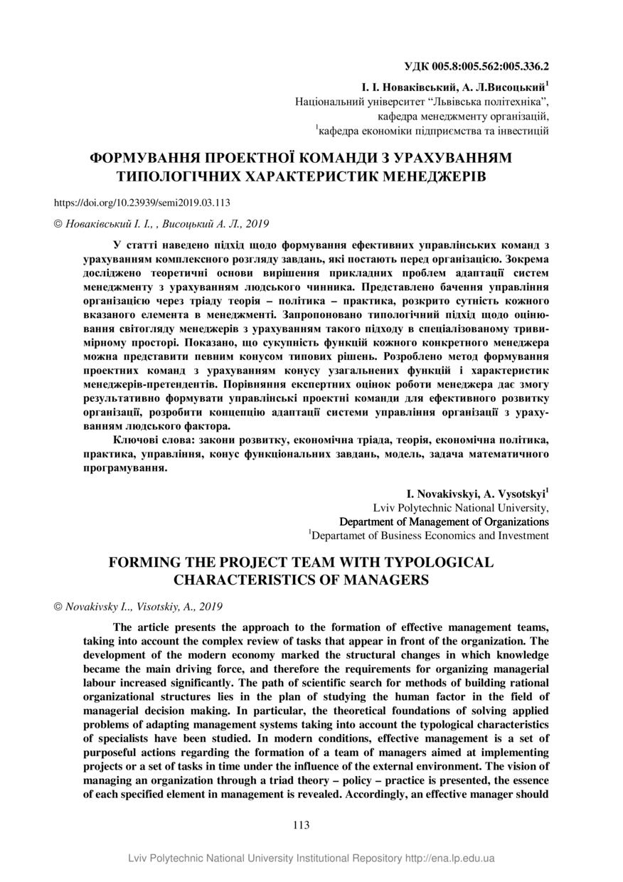 Новаківський І. І. Формування проектної команди з урахуванням типологічних характеристик менеджерів / І. І. Новаківський, А. Л. Висоцький // Вісник Національного університету “Львівська політехніка”. Серія: Проблеми економіки та управління. — Львів : Видавництво Львівської політехніки, 2019. — № 3. — С. 113–121.