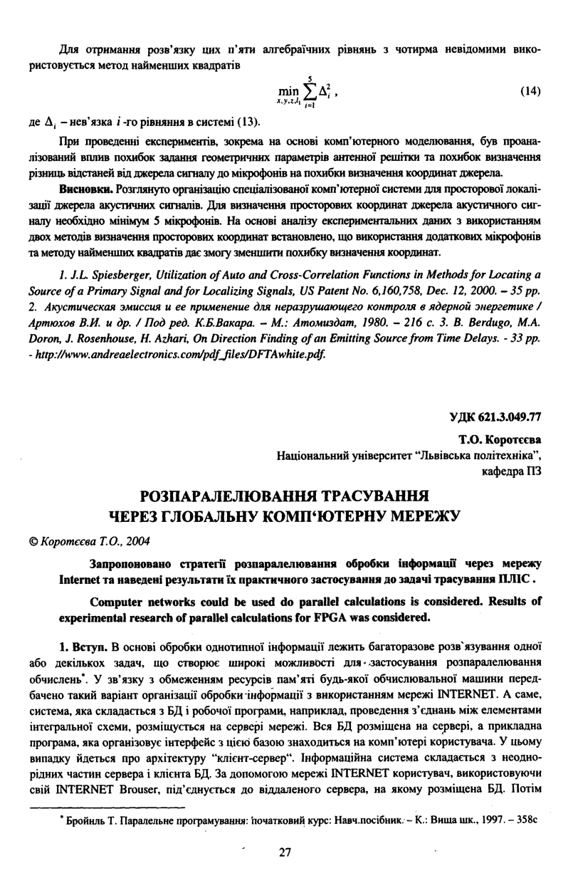 Коротєєва Т. О. Розпаралелювання трасування через глобальну комп'ютерну мережу / Т. О. Коротєєва // Вісник Національного університету “Львівська політехніка”. — Львів : Видавництво Національного університету “Львівська політехніка”, 2004. — № 522 : Комп’ютерні системи проектування. Теорія і практика. — С. 27–30.