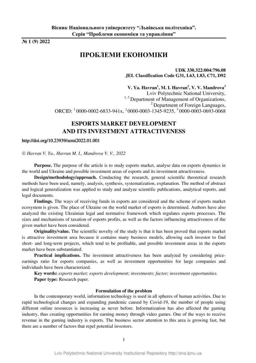 | dc.identifier.citation | Havran V. Ya. Esports market development and its investment attractiveness / V. Ya. Havran, M. I. Havran, V. V. Mandrova // Вісник Національного університету “Львівська політехніка”. Серія: Проблеми економіки та управління. — Lviv : Lviv Politechnic Publishing House, 2022. — Vol 6. — No 1. — P. 1–8. | |