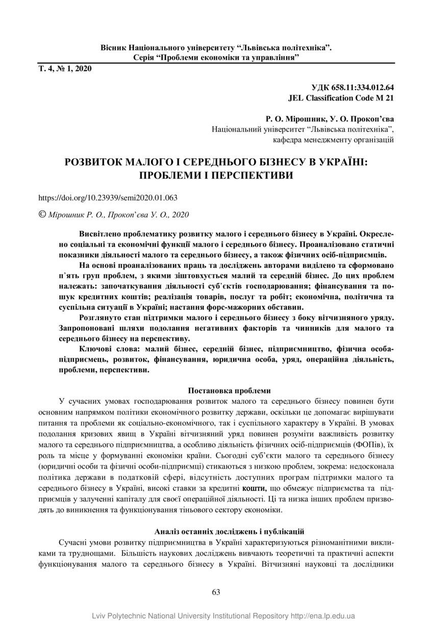 Мірошник Р. О. Розвиток малого і середнього бізнесу в Україні: проблеми і перспективи / Р. О. Мірошник, У. О. Прокоп'єва // Вісник Національного університету “Львівська політехніка”. Серія: "Проблеми економіки та управління". — Львів : Видавництво Львівської політехніки, 2020. — Том 4. — № 1. — С. 63–71.