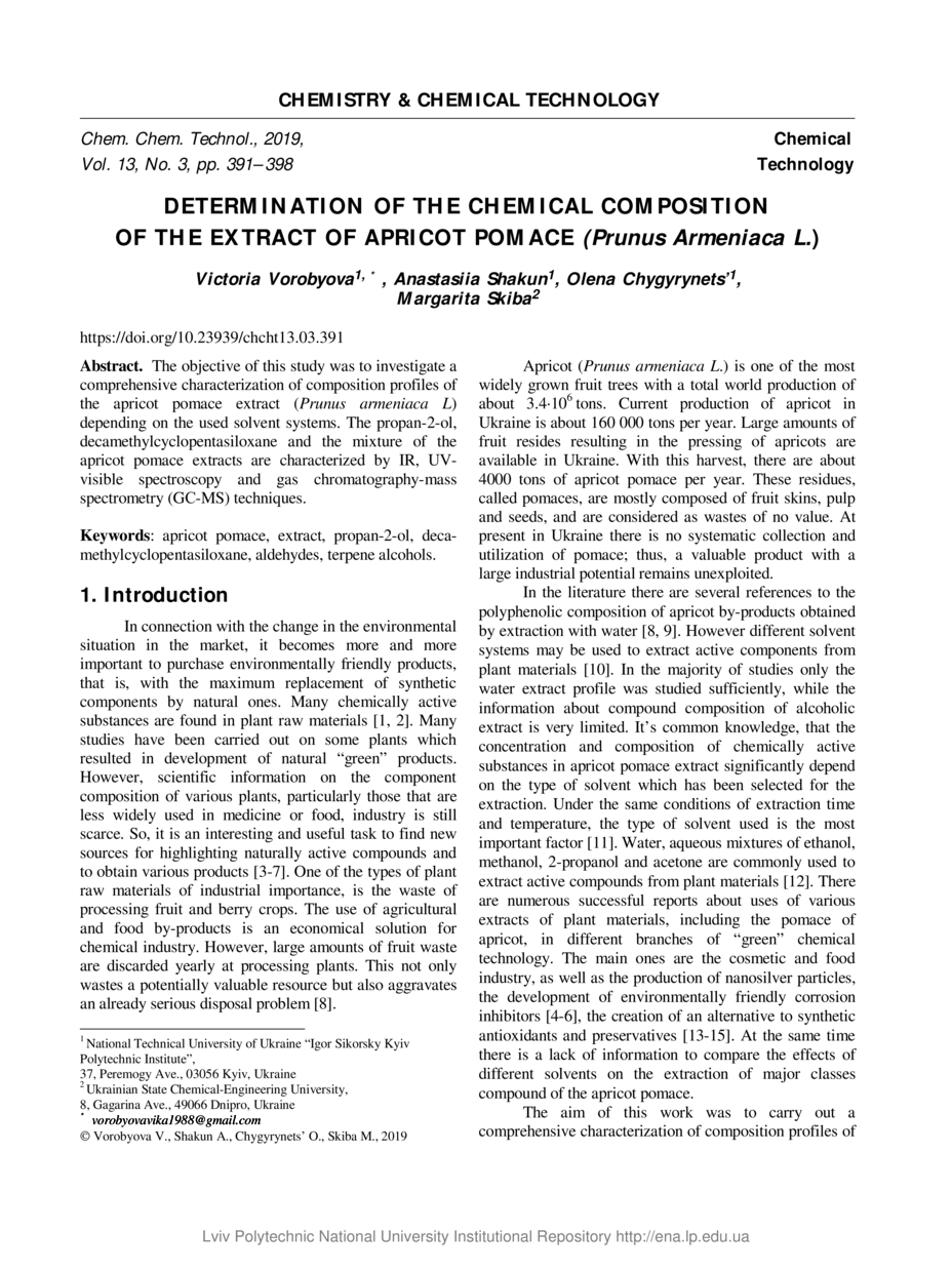 Determination of the Chemical Composition of the Extract of Apricot Pomace (Prunus armeniaca L.) / Victoria Vorobyova, Anastasiia Shakun, Olena Chygyrynets’, Margarita Skiba // Chemistry & Chemical Technology. — Lviv : Lviv Politechnic Publishing House, 2019. — Vol 13. — No 3. — P. 391–398.