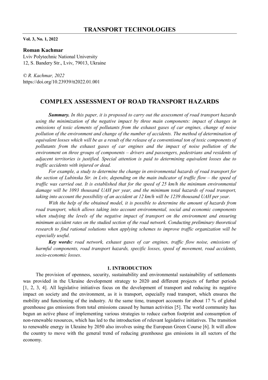 Kachmar R. Complex assessment of road transport hazards / Roman Kachmar // Transport Technologies. — Lviv : Lviv Politechnic Publishing House, 2022. — Vol 3. — No 1. — P. 1–13.