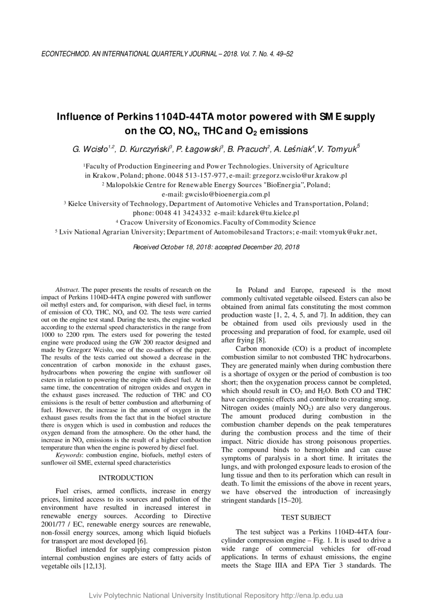 Influence of Perkins 1104D-44TA motor powered with SME supply on the CO, NOx, THC and O2 emissions / G. Wcisło, D. Kurczyński, P. Łagowski, B. Pracuch, A. Leśniak, V. Tomyuk // Econtechmod : scientific journal. — Lviv : Lublin, 2018. — Vol 7. — No 4. — P. 49–52.