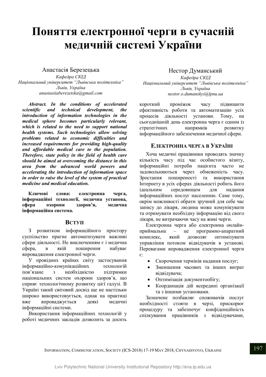 Березецька А. Поняття електронної черги в сучасній медичній системі України / Анастасія Березецька, Нестор Думанський // Інформація, комунікація, суспільство : матеріали 7-ї Міжнародної наукової конференції, 17–19 травня 2018 року, Чинадієво. — Львів : Видавництво Львівської політехніки, 2018. — С. 197–198. — (Електронна демократія та електронне урядування).