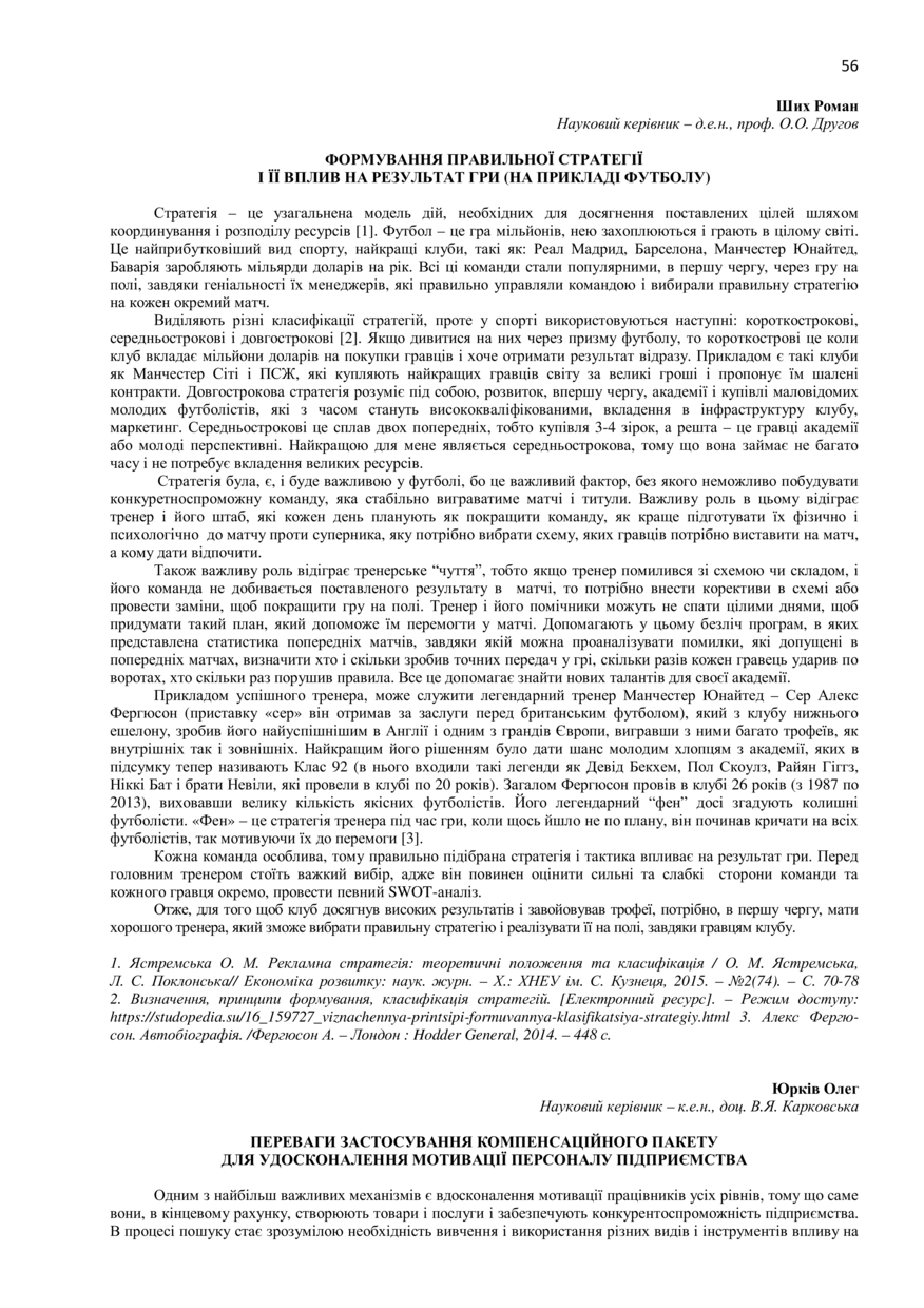 Ших Р. Формування правильної стратегії і її вплив на результат гри (на прикладі футболу) / Роман Ших, О. О. Другов // 77-ма Студентська науково-технічна конференція. Секція "Публічне управління та адміністрування" : збірник тез доповідей, 7 листопада 2019 року, Львів. — Львів : Видавництво Львівської політехніки, 2019. — С. 56. — (Адміністративний менеджмент).