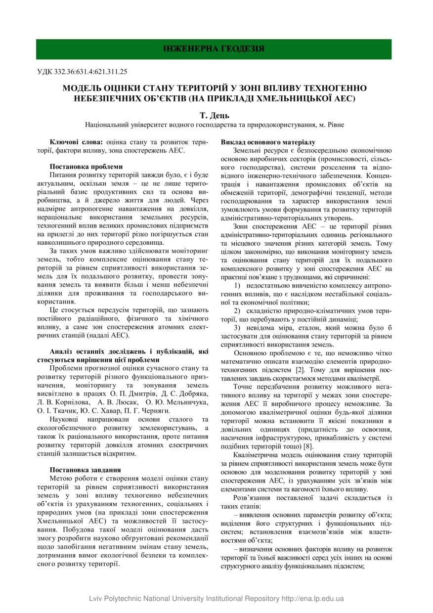 Дець Т. Модель оцінки стану територій у зоні впливу техногенно небезпечних об’єктів (на прикладі Хмельницької АЕС) / Т. Дець // Сучасні досягнення геодезичної науки та виробництва. — Львів, 2017. — Том 1 (33). — С. 83–88.