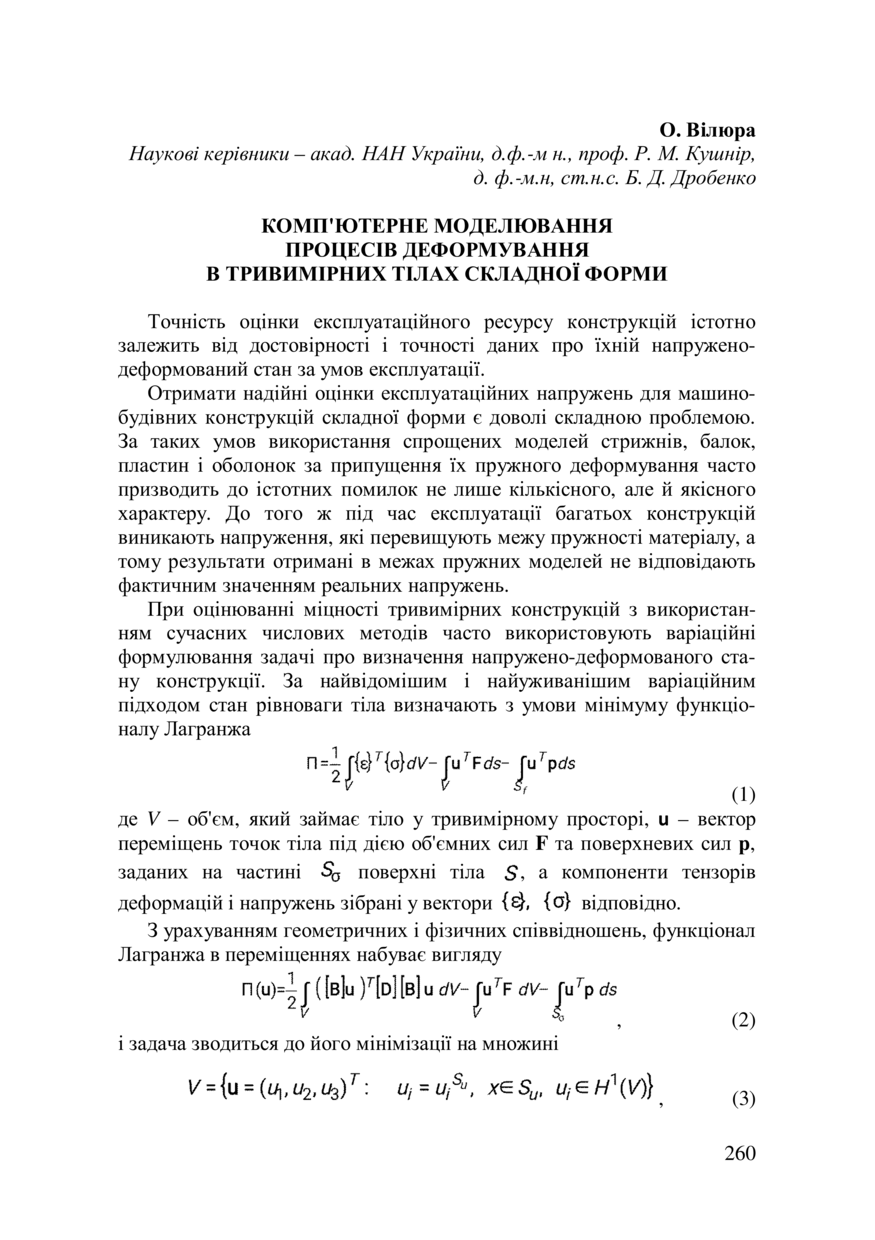 Вілюра О. Комп'ютерне моделювання процесів деформування в тривимірних тілах складної форми / О. Вілюра, Р. М. Кушнір, Б. Д. Дробенко // 77-ма Студентська науково-технічна конференція : збірник тез доповідей, жовтень, Львів. — Львів : Видавництво Львівської політехніки, 2019. — С. 260–261. — (Секція прикладної математики та фундаментальних наук).