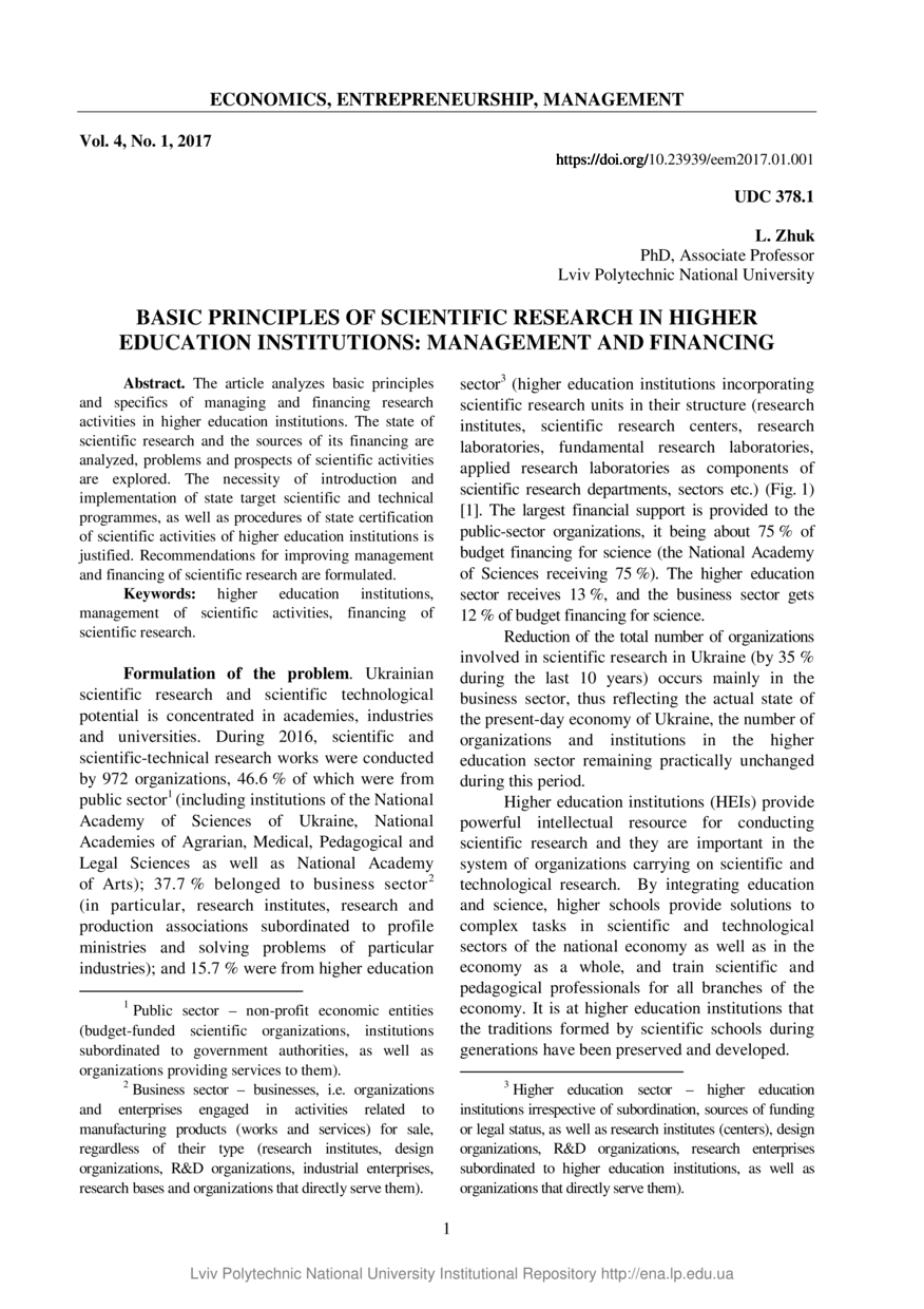 Zhuk L. Basic principles of scientific research in higher education institutions: management and financing / L. Zhuk // Economics, Entrepreneurship, Management. — Lviv : Lviv Politechnic Publishing House, 2017. — Vol 4. — No 1. — P. 1–14.