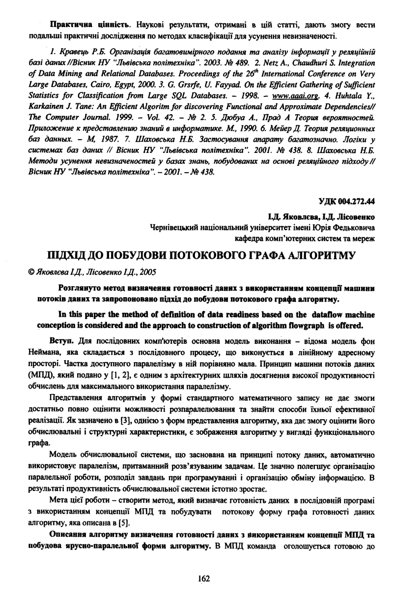 Яковлева І. Д. Підхід до побудови потокового графа алгоритму / І. Д. Яковлева, І. Д. Лісовенко // Вісник Національного університету “Львівська політехніка”. — Львів : Видавництво Національного університету “Львівська політехніка”, 2005. — № 546 : Комп’ютерні системи та мережі. — С. 162–165.