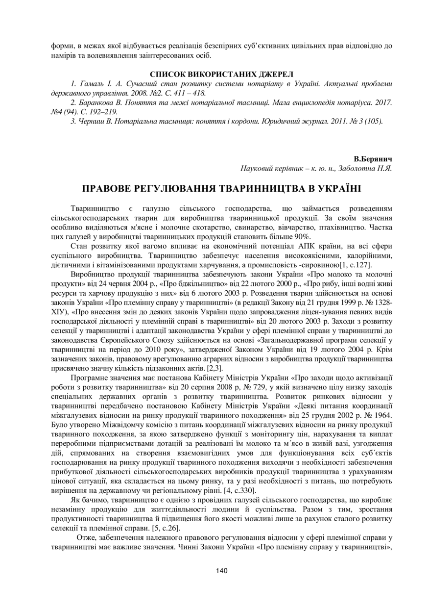 Берянич В. Правове регулювання тваринництва в Україні / В. Берянич, Н. Я. Заболотна // 76-та Студентська науково-технічна конференція. Секція права та психології : збірник тез доповідей, 15–29 жовтня 2018 року, Львів. — Львів : Видавництво Львівської політехніки, 2018. — С. 140–141. — (Цивільногого права та процесу).