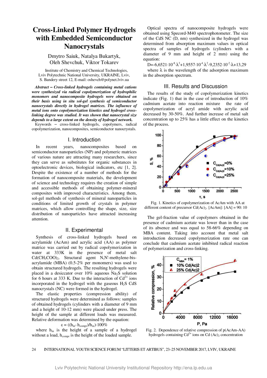 Cross-linked polymer hydrogels with embedded semiconductor nanocrystals / Dmytro Saiuk, Natalya Bukartyk, Oleh Shevchuk, Viktor Tokarev // Litteris et Artibus : proceedings, 23–25 November, 2017. — Lviv : Lviv Polytechnic Publishing House, 2017. — P. 24–25. — (6th International academic conference «Chemistry & chemical technology 2017» (CCT-2017)).