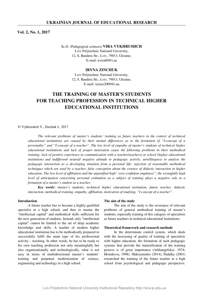 Vykhrushch V. The training of master’s students for teaching profession in technical higher educational institutions / Vira Vykhrushch, Iryna Zinchuk // Ukrainian Journal of Educational Research. — Lviv : Lviv Politechnic Publishing House, 2017. — Vol 2. — No 1. — P. 67–70.