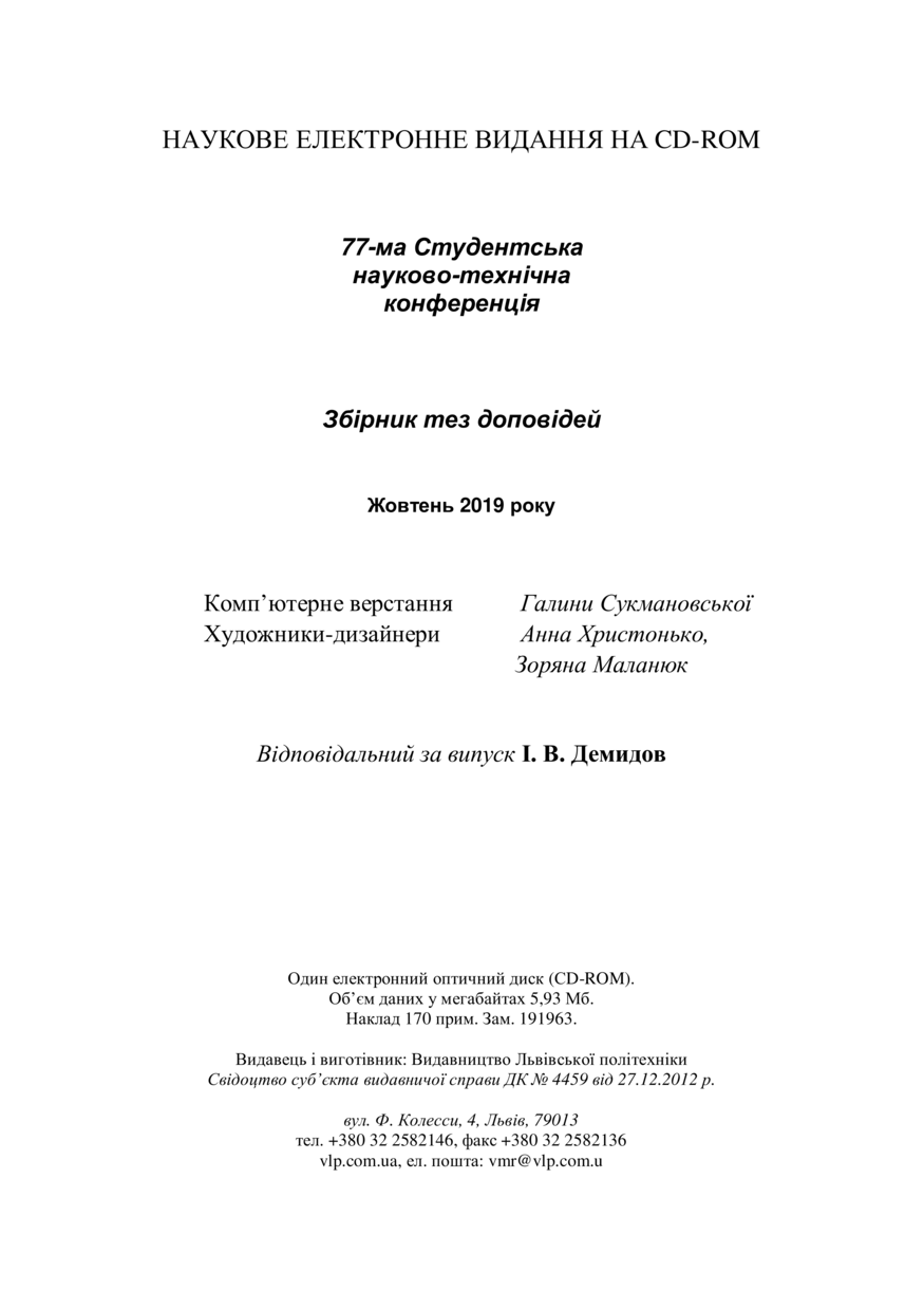 | dc.relation.ispartof | 77-ма Студентська науково-технічна конференція : збірник тез доповідей, 2019 | |