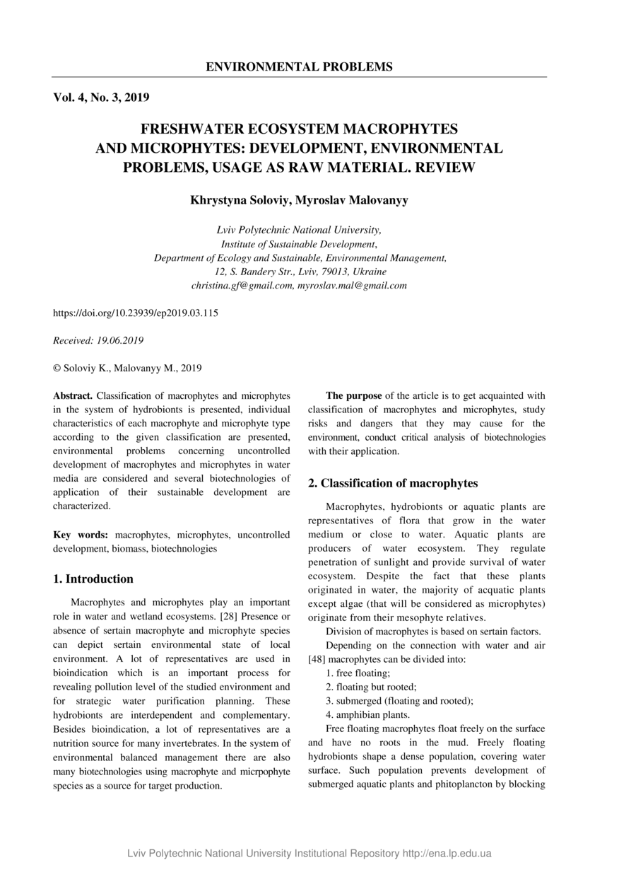 Soloviy K. Freshwater ecosystem macrophytes and microphytes: development, environmental problems, usage as raw material. Review / Khrystyna Soloviy, Myroslav Malovanyy // Environmental Problems. — Lviv : Lviv Politechnic Publishing House, 2019. — Vol 4. — No 3. — P. 115–124.