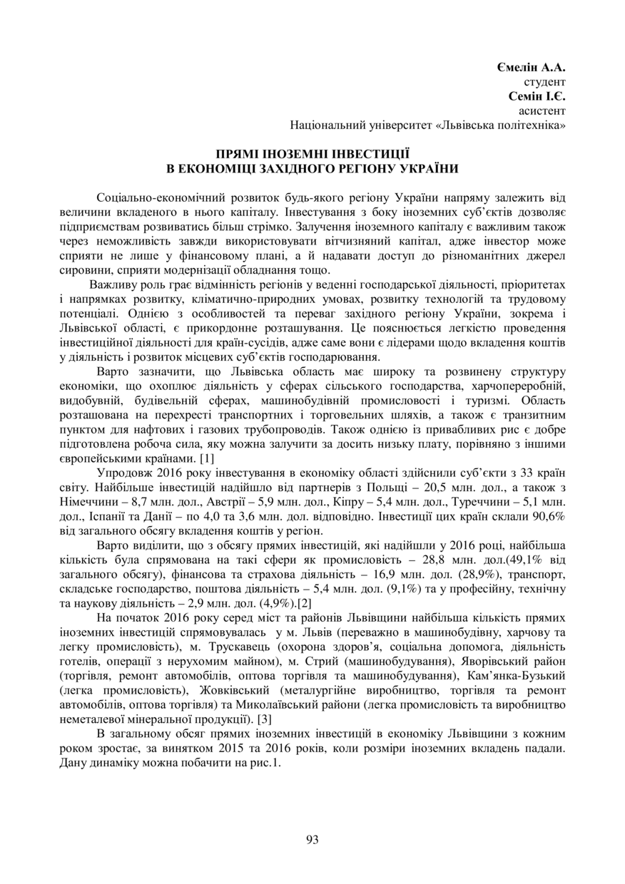 Ємелін А. А. Прямі іноземні інвестиції в економіці західного регіону України / А. А. Ємелін, І. Є. Семін // Економічний розвиток держави, регіонів і підприємств: проблеми та перспективи : матеріали ІІ Міжнародної науково-практичної конференції молодих учених, 18–19 травня 2017 року, Львів. — Львів : Видавництво Львівської політехніки, 2017. — С. 93–94. — (Вплив зовнішніх і внутрішніх чинників на економічний розвиток регіонів).