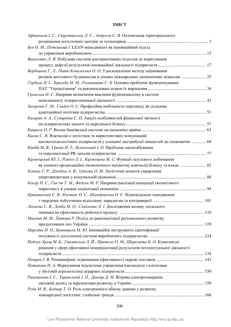 Зміст до Вісника Національного університету «Львівська політехніка». Серія: Логістика // Вісник Національного університету «Львівська політехніка». Серія: Логістика. — Львів : Видавництво Львівської політехніки, 2017. — № 863. — С. 300–304.